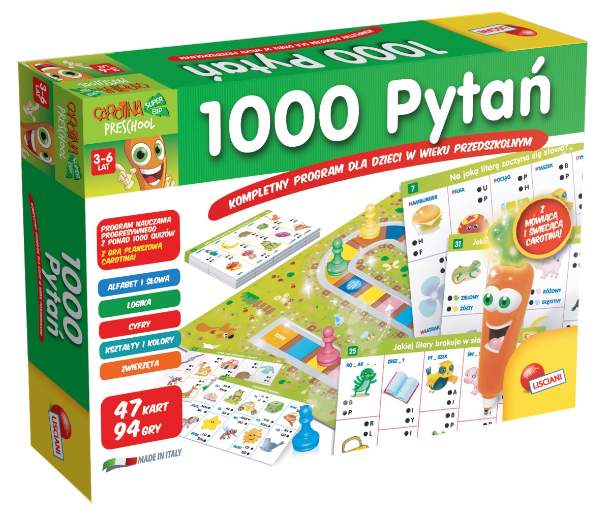 W opakowaniu znaleźć można planszę, 4 pionki, spinner, wiele interaktywnych kart, ponad 1000 quizów uczących wielu zagadnień metodą „ciągłego powtarzania”. Gdy odpowiedź jest poprawna, Carotina zaświeci się i nagrodzi dziecko wesołymi okrzykami!