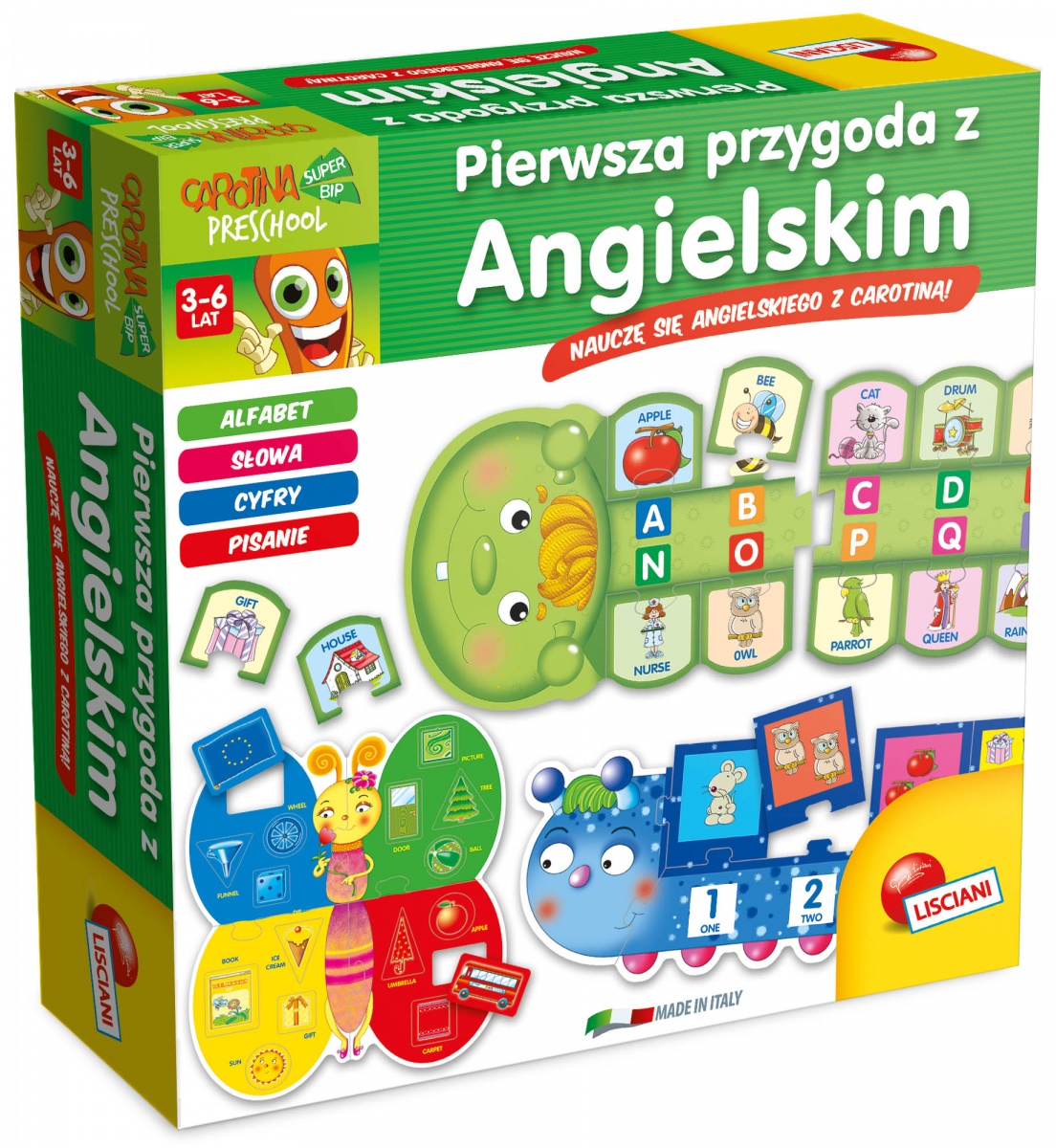 Zestaw edukacyjnych zabaw stworzony do nauki angielskiego dla dzieci w wieku przedszkolnym. Dziecko może układać trzy zabawne, dużego rozmiaru puzzle w kształcie motyla i dwóch gąsienic. Poprzez dopasowywanie elementów tych puzzli dziecko nauczy się rozpoznawać litery, słowa, cyfry wraz z ilościami, kształty i kolory.