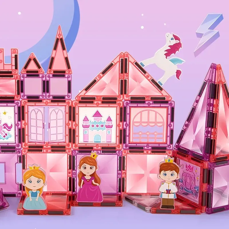 W skład zestawu wchodzą 126 kolorowych elementów magnetycznych — płytki w różnych kształtach i kolorach, elementy przezroczyste, dodatkowe ozdoby tematyczne „księżniczkowe”, które umożliwiają tworzenie zarówno podstawowych brył, jak i fantazyjnych struktur 3D. Dzięki silnym magnetom dzieci mogą swobodnie budować, łączyć ze sobą ściany, dachy i dekoracje, co pobudza myślenie przestrzenne i twórcze.